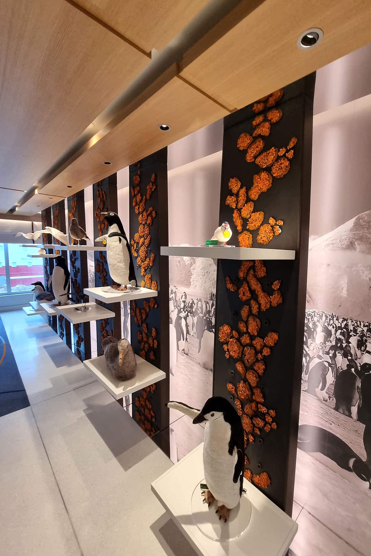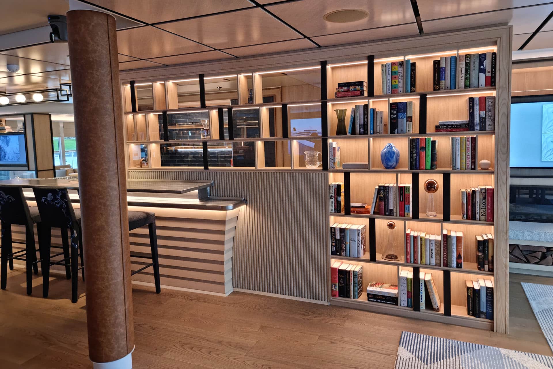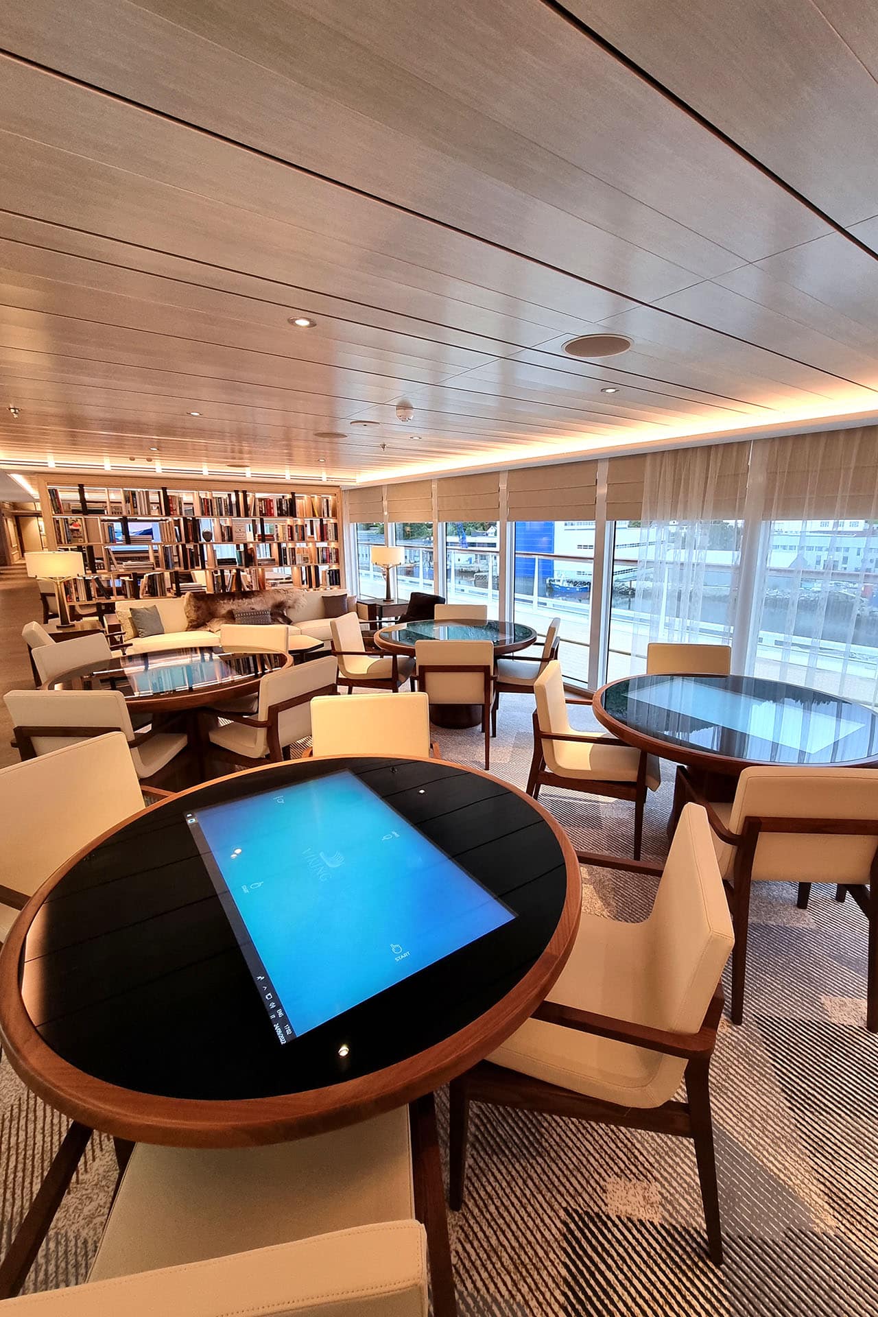 Uno degli ambienti più interessanti realizzati per Viking Polaris da Naval Interior è la Library, situata al deck 5, accanto a all’Explorer’s Lounge Upper Level. La biblioteca ospitata dai nostri scaffali è stata curata dalla prestigiosa libreria londinese Heywood Hill e dall’Università di Cambridge (Scott Polar Research Institute) e contiene volumi sulle esplorazioni polari che consentono di arricchire e migliorare l’esperienza avventurosa, per una totale immersione nel mood del viaggio.